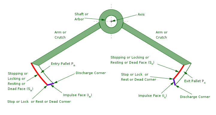 Пара анкерных зубов (входной и выходной зуб) соприкасается с анкерным колесом, у которого зубья должны быть очень короткими.