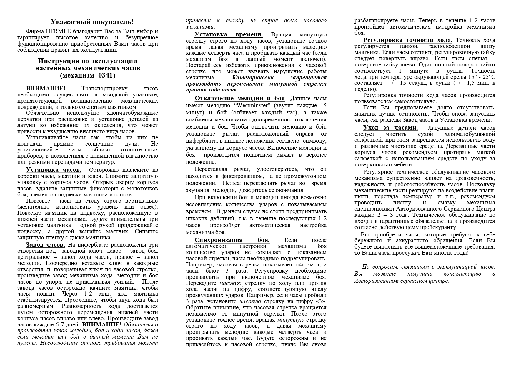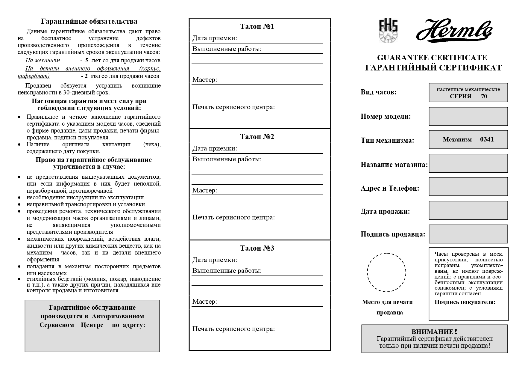 На все часы Hermle, которые Вы приобретаете в салонах или интернет магазине Mystery Time, действует 2-х летняя международная гарантия производителя. В случае возникновения гарантийного случая, Вам необходимо обратиться по адресу, указанному в гарантийном талоне. Обращение в любой другой сервисный центр аннулирует Вашу официальную гарантию.