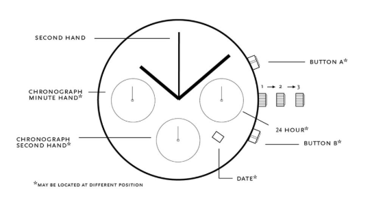 ИСПОЛЬЗОВАНИЕ ХРОНОГРАФА: Этот хронограф может измерять и отображать время за 1/1 секунды с максимальным значением 59 минут 59 секунд. Нажмите кнопку A, чтобы запустить или остановить часы. Нажмите кнопку B, чтобы вернуть секундомер в исходное положение. СБРОС ХРОНОГРАФА (ТАКЖЕ ПОСЛЕ ЗАМЕНЫ БАТАРЕИ): Когда секундная стрелка хронографа не возвращается в нулевое положение после сброса и замены батареи. Вытяните заводную головку в 3-е положение. Нажмите кнопку A, чтобы установить секундную стрелку хронографа в нулевое положение.  Стрелку хронографа можно быстро продвигать, непрерывно нажимая кнопку A. Верните заводную головку в положение 1.