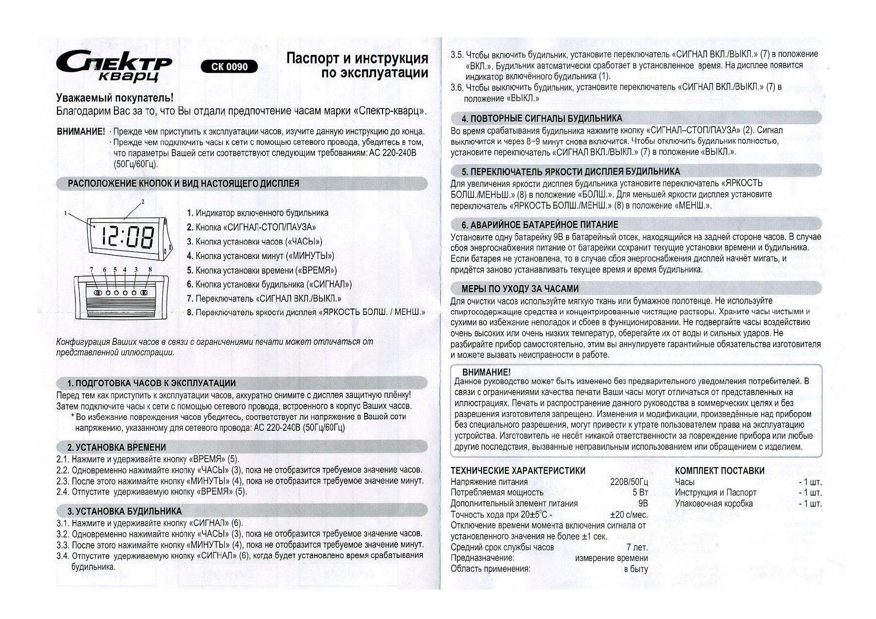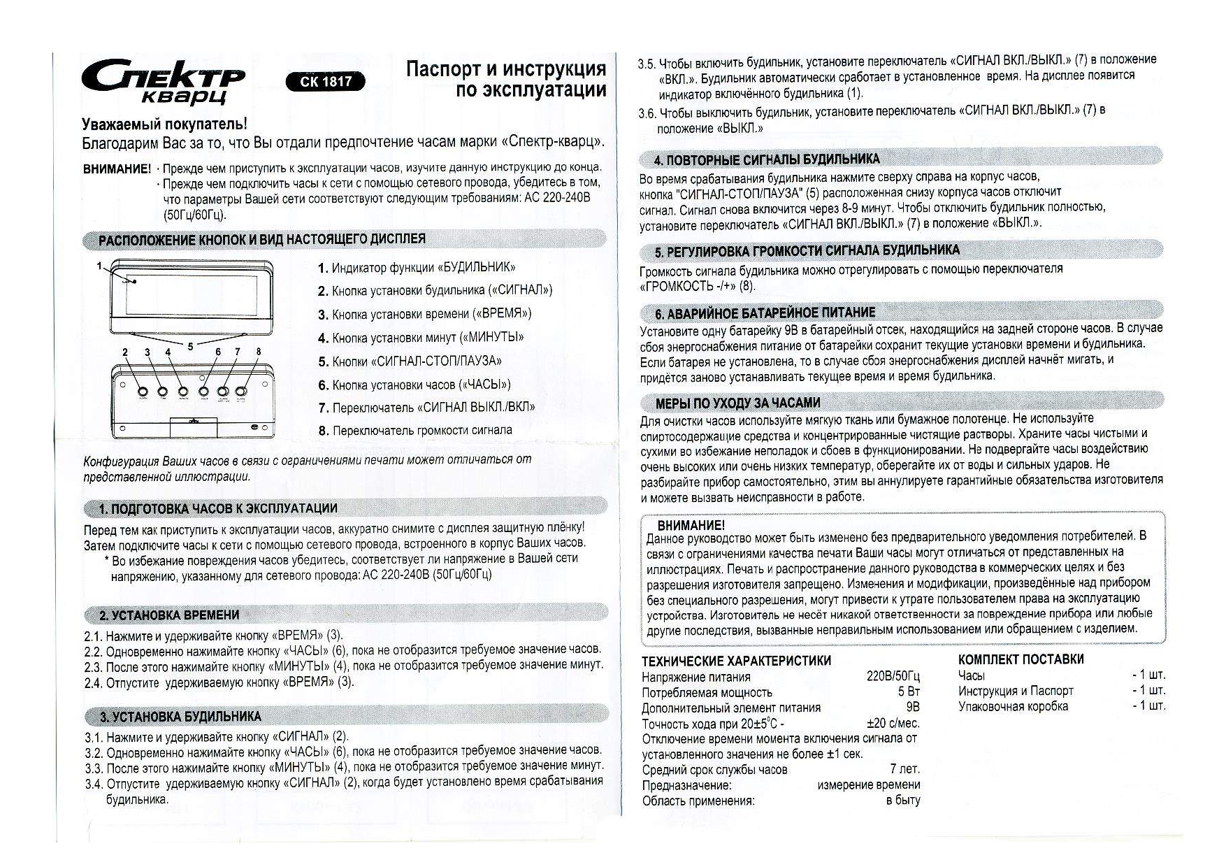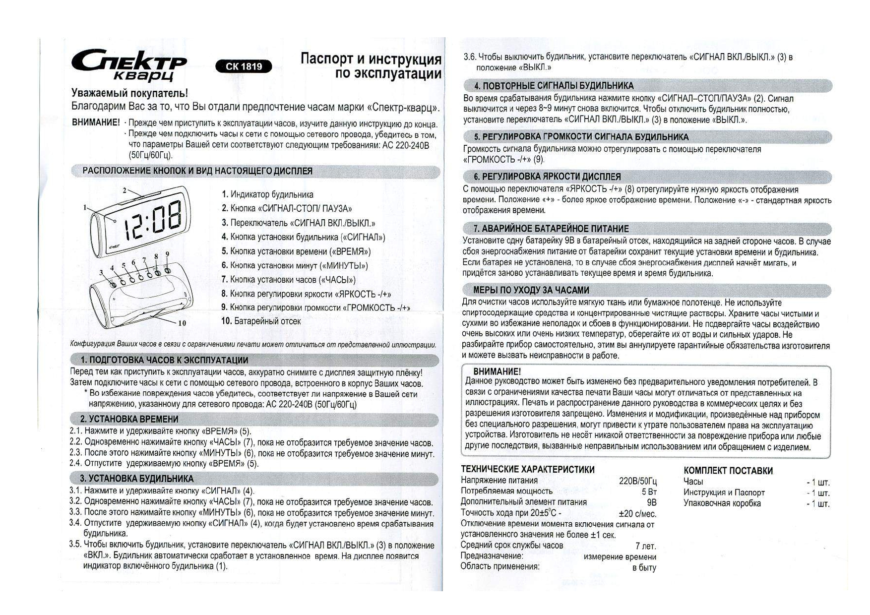 Ниже приведены самые распространенные инструкции к будильникам СПЕКТР: СК 1811, СК0610, СК0090, СК0720, СК0918, СК1215, СК1817, СК1819